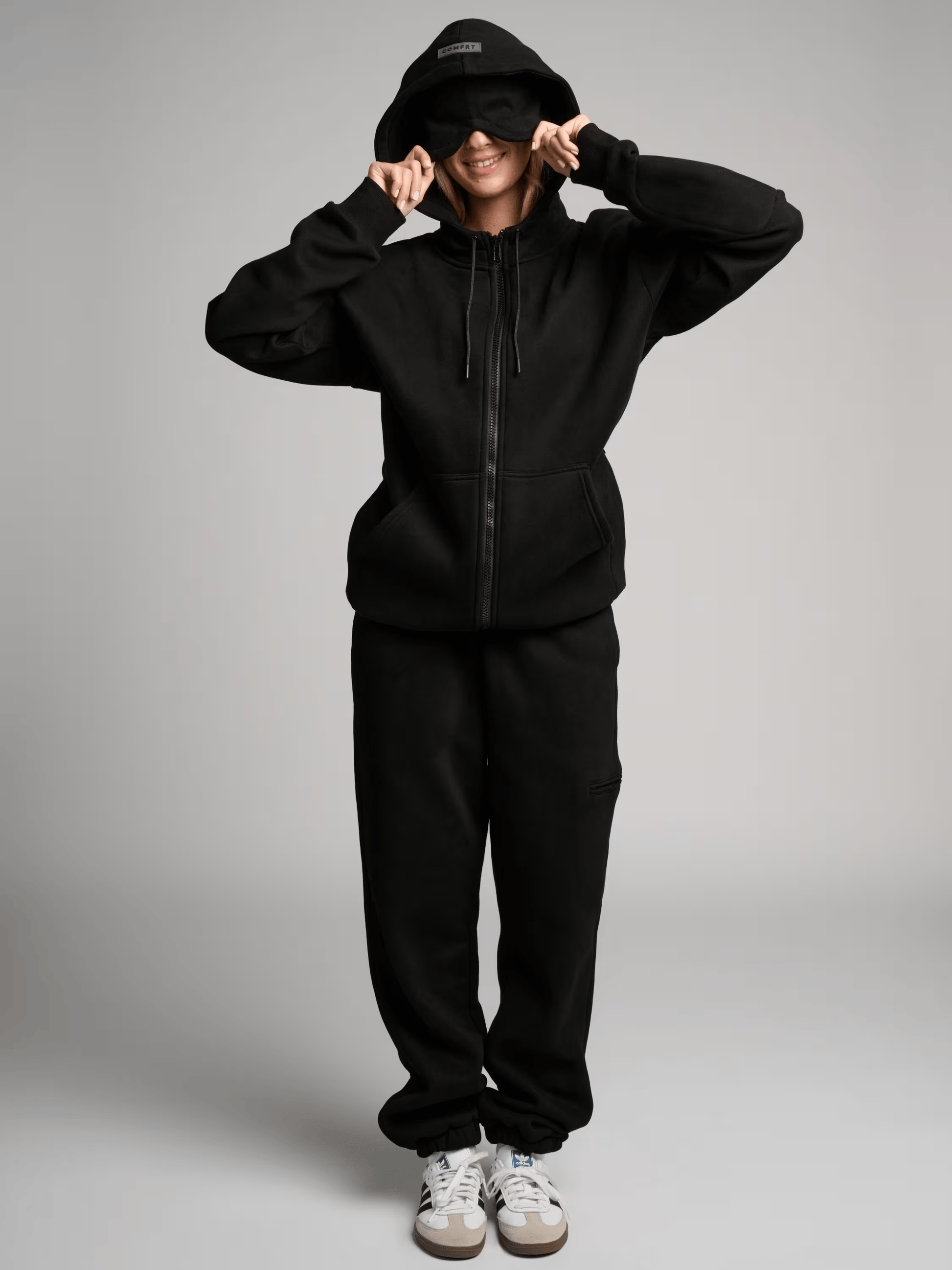 Say goodbye to sleepless flights! The built-in eyemask in the hoodie’s oversized hood ensures that you can rest undisturbed, even in the brightest environments. Just zip up and relax—perfect for napping during long trips.