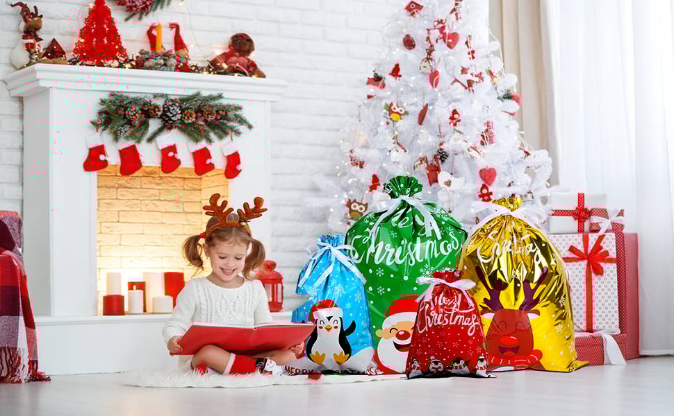 - Christmas drawstring gift bags in bulk, perfect for Christmas decoration, Christmas gift wrapping, classrooms, party favors storage, holiday gift extra-special, weddings, Christmas trees, wine bottles and more.