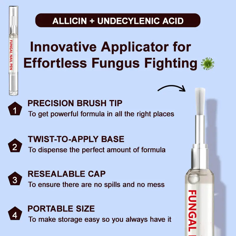 Our Fungal Nail Pen’s secret to success lies in two clinically proven ingredients that work together to eliminate fungus and restore nail health. On one side, Allicin (garlic extract) delivers natural antifungal power to target fungal growth at the source; on the other, Undecylenic Acid (a trusted skincare staple) penetrates deep to combat infection and prevent recurrence. Together, they form a dynamic duo that’s gentle on nails but tough on fungus—no harsh chemicals, just science-backed results!