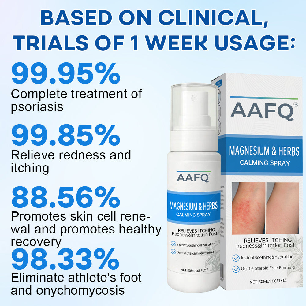 AAFQ® Magnesium & Herbs Calming Spray has passed clinical tests and meets FDA skincare standards. Its special formula can effectively relieve various stubborn skin problems. With continuous use for just 2–5 days, it can quickly soothe redness, itching, flaking, and cracking caused by eczema, psoriasis, and contact dermatitis. For skin growths such as warts and skin tags, obvious dryness and shedding can appear within one week.