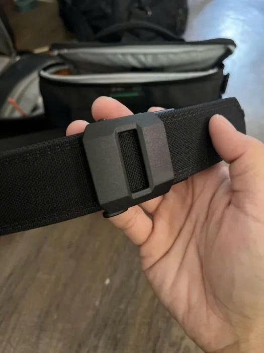 The belt is sturdy and the buckle holds it very well. I use it to attach a holster and some accessories and it is comfortable and does not slip off. Worth the money!
